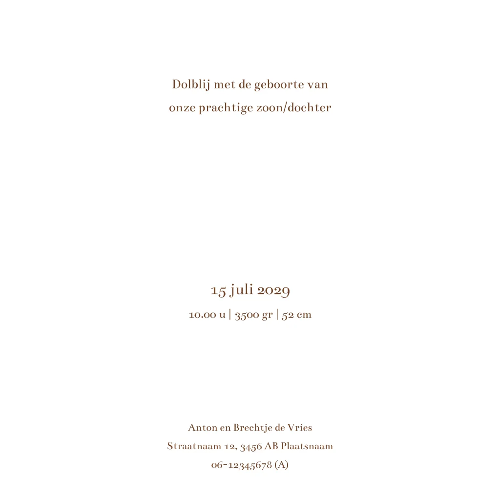 Ideaal voor ouders die op zoek zijn naar een lief geboortekaartje met dieren. Het kaartje is eenvoudig te personaliseren met naam, geboortedatum en eigen teksten in onze online editor.