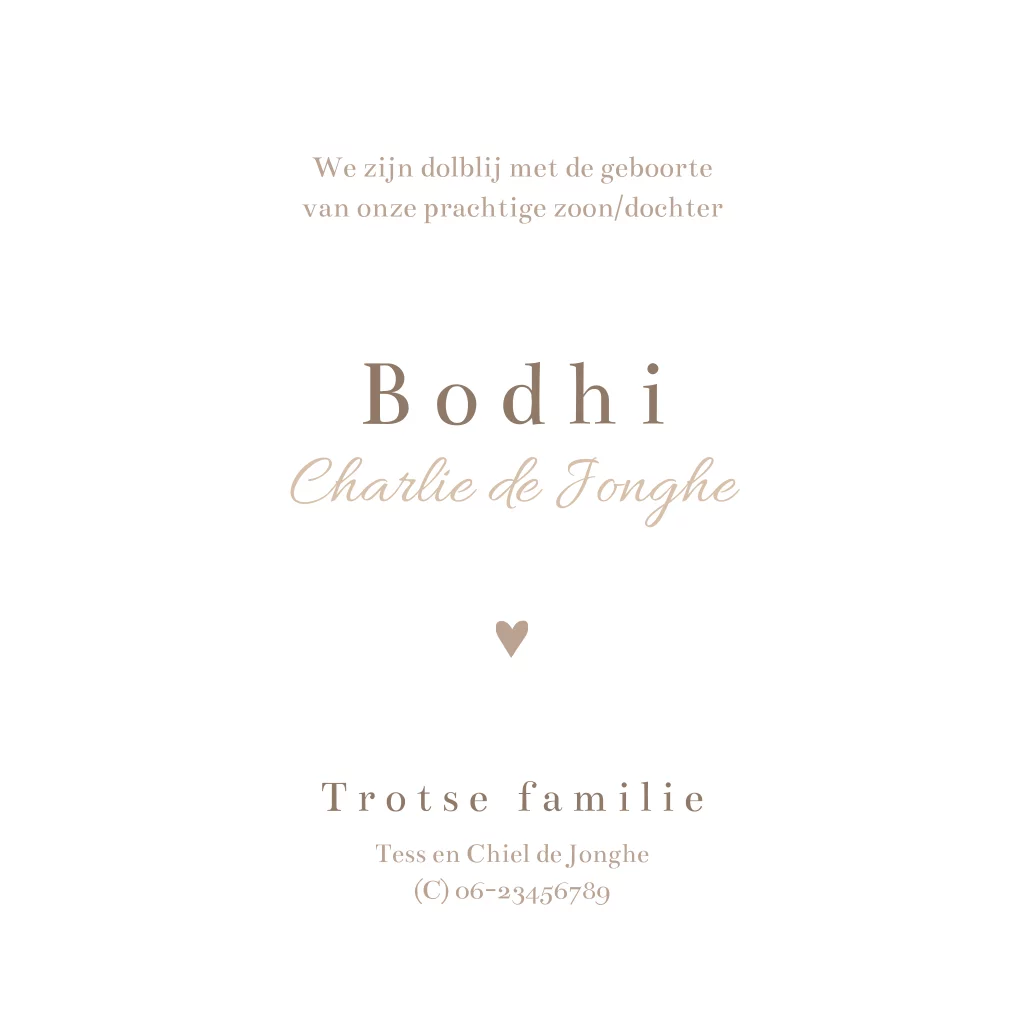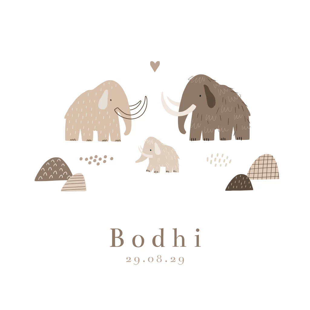 Leuk, wit geboortekaartje met getekende mammoet familie in bruine en beige tinten. Kondig de geboorte van je kleine aan met dit originele geboortekaartje! Liever andere lettertypes of kleuren? Pas dit kaartje naar eigen smaak eenvoudig aan in onze editor en bestel een proefdrukje.