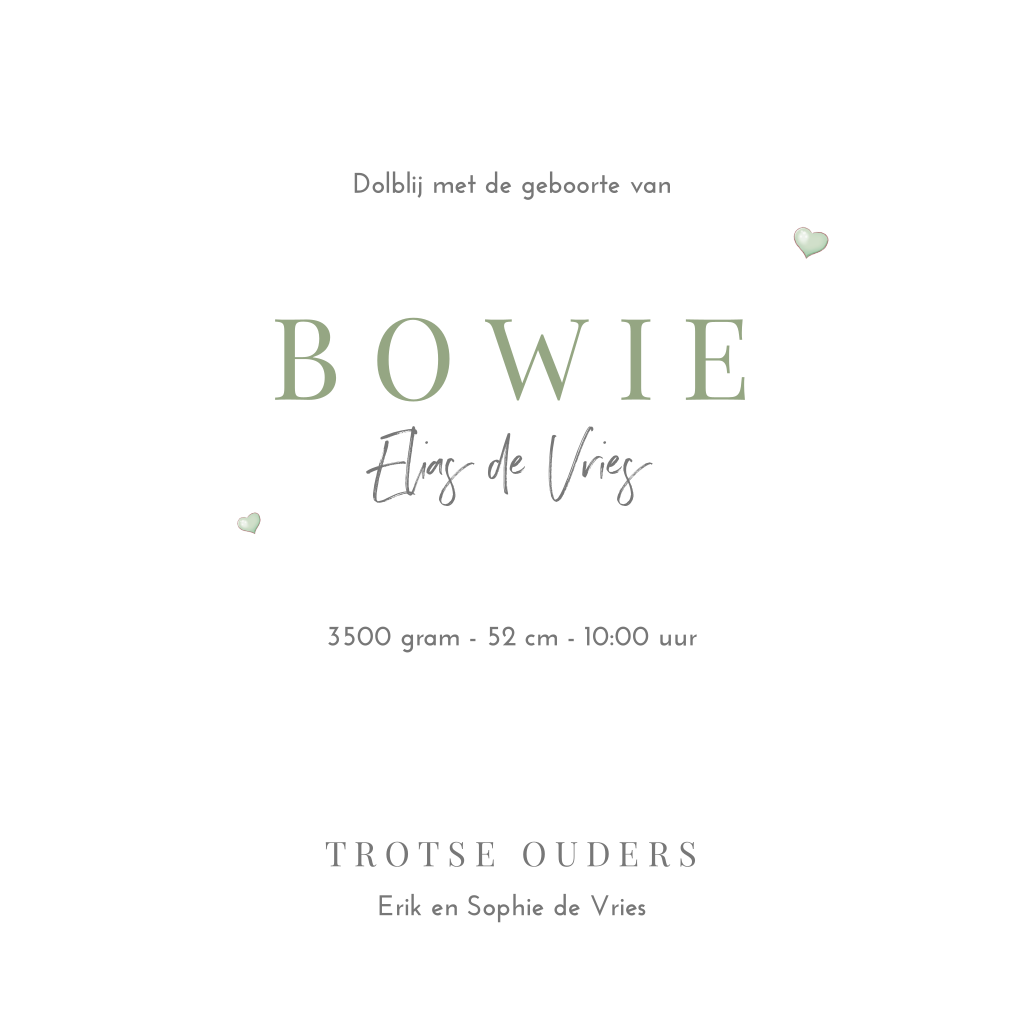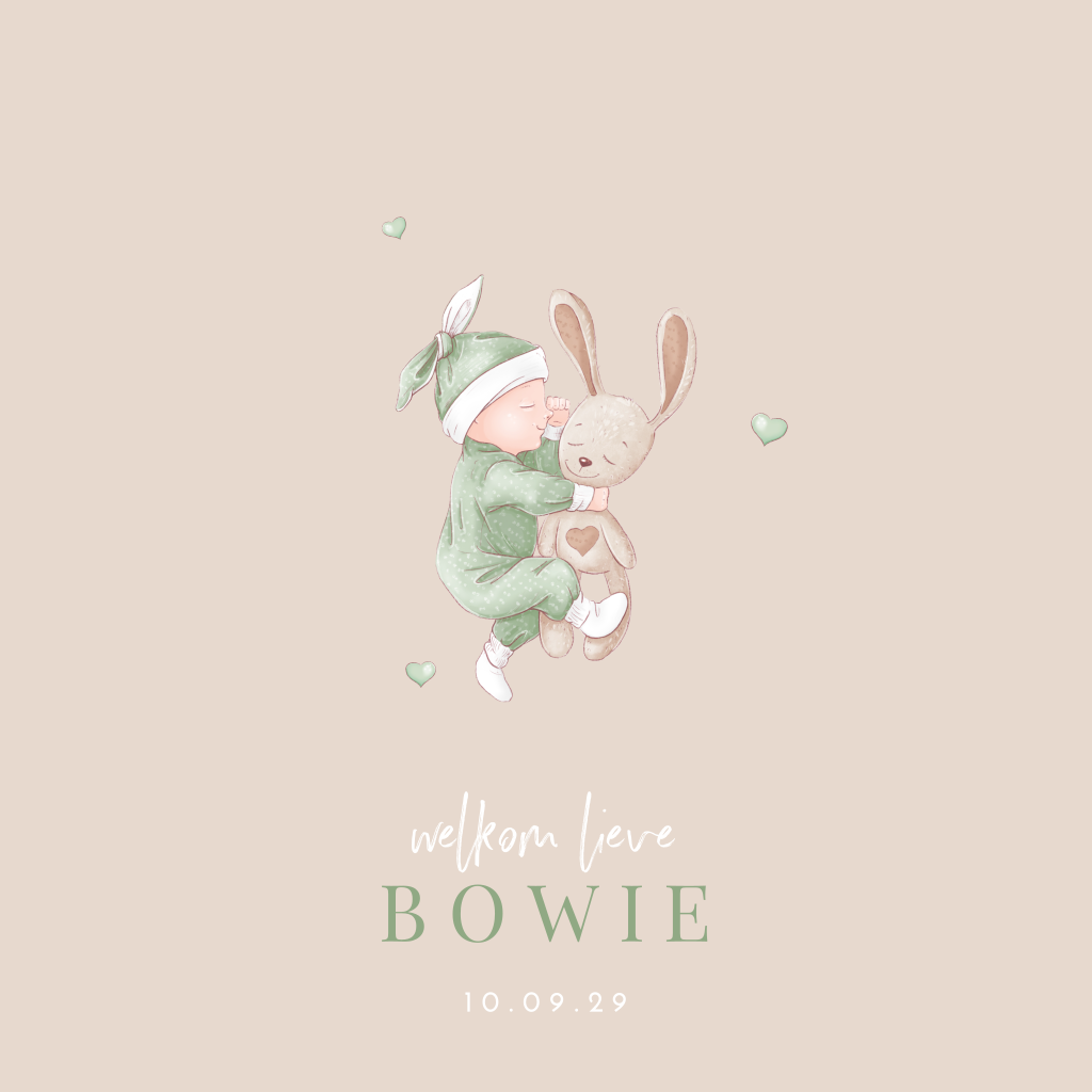 Teder geboortekaartje met een schattige illustratie van een rustende baby, gehuld in een zachtgroen pakje en muts. De baby ligt op zijn zij en koestert een liefdevolle knuffel (een konijn) in zijn armpjes. Deze ontroerende scène wordt omringd door hartjes op een rustige beige achtergrond. Pas het kaartje eenvoudig aan naar wens met behulp van onze editor en vraag een drukproef aan voor het perfecte resultaat.