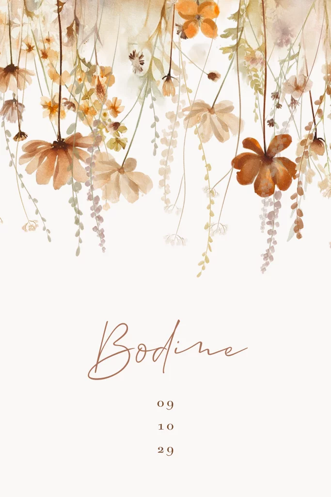 Prachtig geboortekaartje met waterverf veldbloemen in mooie, roestkleurige en beige tinten. De naam van je kindje komt in sierlijke letters voorop, in een bijpassende bruine tint. De ronde hoeken maken dit mooie kaartje af, maar natuurlijk kun je ook voor rechte hoeken kiezen. Ook de rest van dit sfeervolle geboortekaartje is aan te passen in onze handige editor.