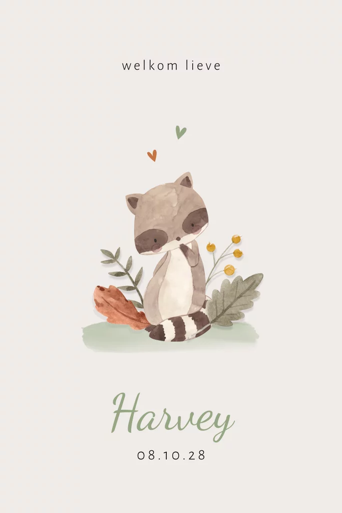 Ontzettend lief geboortekaartje met waterverf wasbeertje tussen de blaadjes. De naam van je kindje komt in groene letters onder het wasbeertje. Verwacht je een kindje in de herfst? Dan is dit een heel geschikt kaartje! De herfstblaadjes in groen, bruin en geel sluiten goed aan bij dit gezellige seizoen.