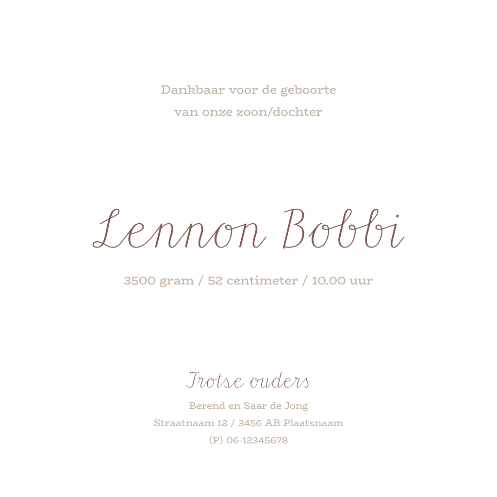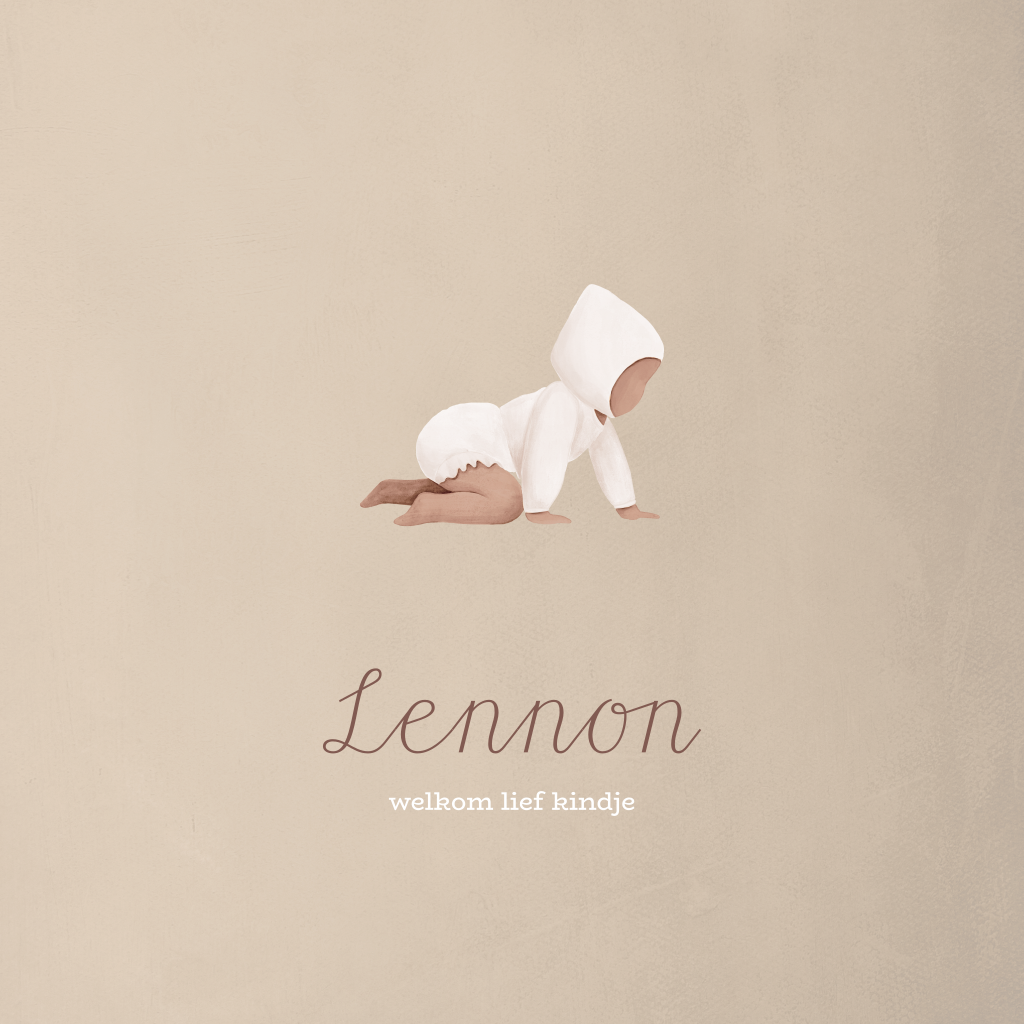 Eenvoudig en stijlvol geboortekaartje in trendy zandkleur met waterverf kindje en sierlijke naam. Ook aan de binnenzijde van dit vierkante ontwerp staat een lieve illustratie van de baby met daaronder ruimte voor een mooie quote of gedichtje en de geboortedatum. Kies eventueel een andere illustratie van een kindje in de map 'Waterverf baby' in onze editor.