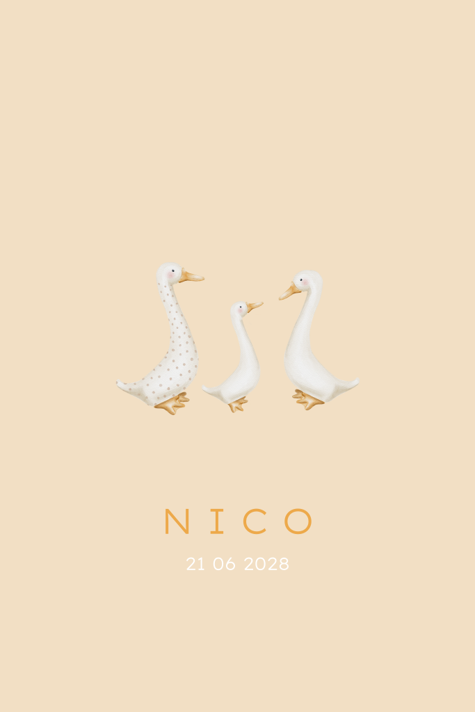 Schattig zachtgeel geboortekaartje met drie gansjes voorop. De kleinste gans staat in het midden tussen de twee grotere gansjes. Wat een lieve familie! Dit minimalistische ontwerp kunt het ontwerp eenvoudig aanpassen met de editor. Misschien wil je een andere kleur achtergrond of lettertype? Open de tool en pas naar wens aan.