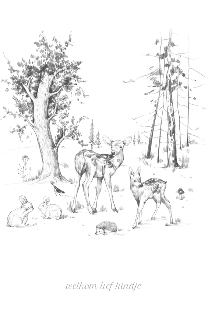 Sfeervol geboortekaartje met potloodtekening van hertjes in het bos, samen met konijntjes, een egel en vogeltje. In glimmend goudfolie komt de naam van je kindje onder de subtiele tekening. Liever een andere achtergrondkleur of de foliekleur wijzigen? Maak eventueel aanpassingen in onze handige editor en geef je eigen draai aan dit lieve, witte geboortekaartje.