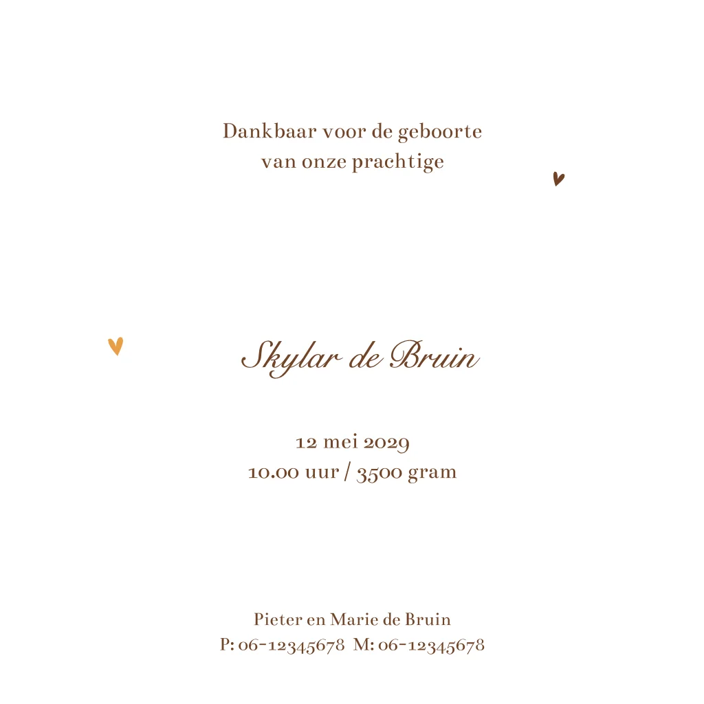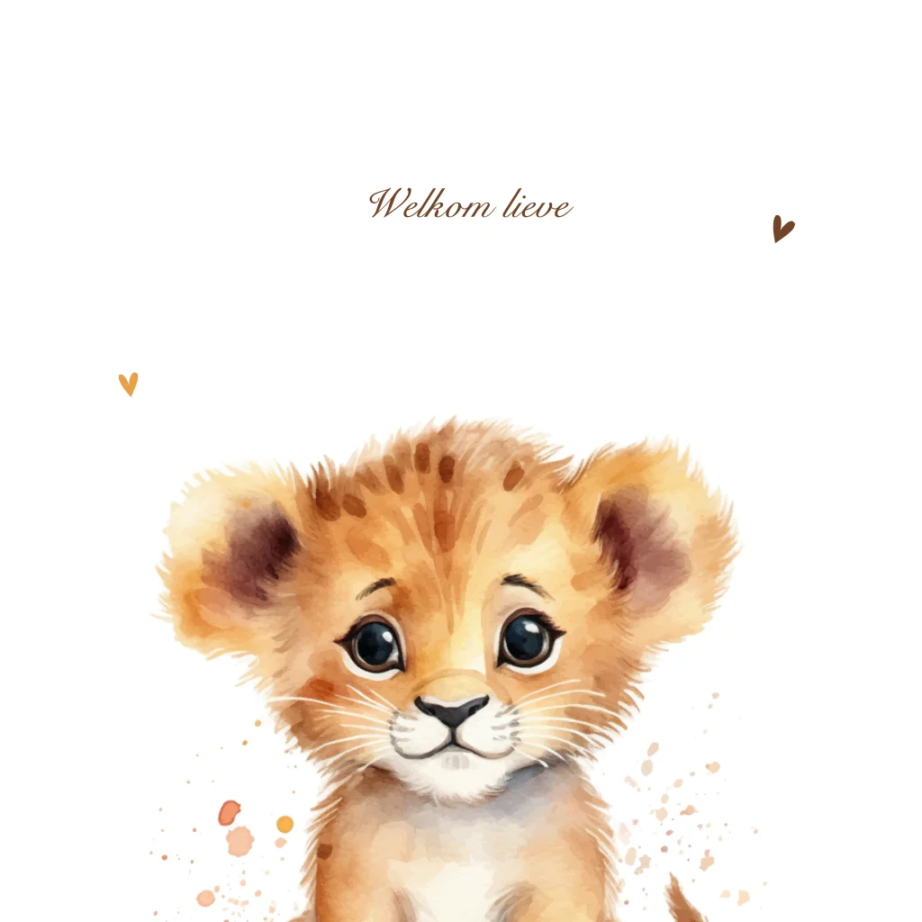 Welkom op de wereld, kleine welp! Verwelkom je kleintje met een bijzonder geboortekaartje, versierd met prachtig goudfolie en een schattig leeuwtje en hartjes. Dit witte kaartje straalt warmte en liefde uit, perfect om de komst van jullie nieuwste familielid te vieren. Aan de binnenzijde komt het waterverf leeuwtje terug, nieuwsgierig in de hoek van de kaart. Plaats een lief gedichtje en de geboortegegevens van je kindje in de kaart om het geheel af te maken. Bestel een proefdrukje om dit geboortekaartje in het echt te kunnen bewonderen.