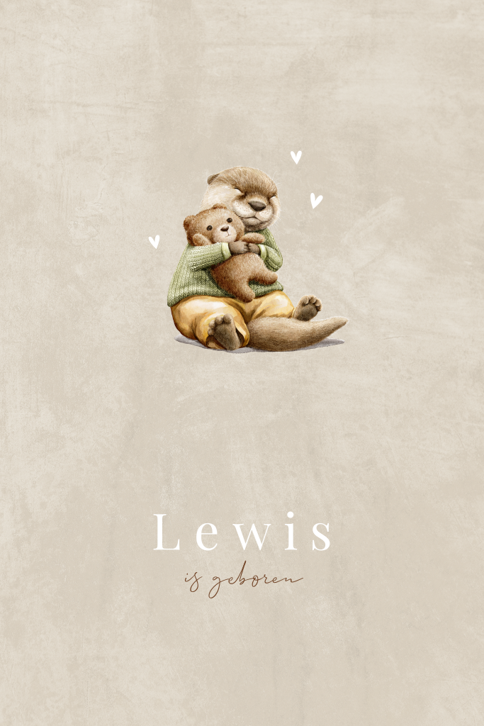 Schattig geboortekaartje met beige achtergrond, goudfolie naam en een lief getekende otter die zijn teddybeertje knuffelt. De naam van je kindje komt in gouden letters voorop en de kaart wordt verder versierd met gouden hartjes. Een ontzettend zoet ontwerp om de komst van je kleintje mee aan te kondigen!