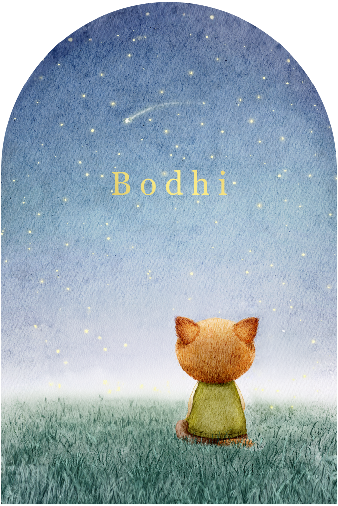 Een prachtig geboortekaartje met getekende afbeelding van een vosje die in het gras naar de sterrenhemel kijkt. Een vallende ster vliegt voorbij boven de goudfolie naam van je kindje. Op de achterkant komt het vosje terug en worden bepaalde details ook in glimmend goudfolie gedrukt. Dit kaartje wordt daarnaast in een unieke vorm gedrukt, extra bijzonder dus! Pas deze kaart zelf aan in onze editor en bestel een proefdruk.
