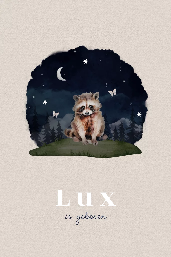 Op zoek naar een bijzonder geboortekaartje voor je aanstaande kindje? Op dit beige ontwerp met afgeronde hoeken staat een prachtige illustratie van een lief wasbeertje in de nacht. De motjes, maan en sterretjes maken het geheel helemaal af. De naam van je zoon of dochter komt in glimmend gouden letters onder het nachtelijke tafereeltje. Bestel een proefdruk om dit kaartje in het echt te kunnen zien.