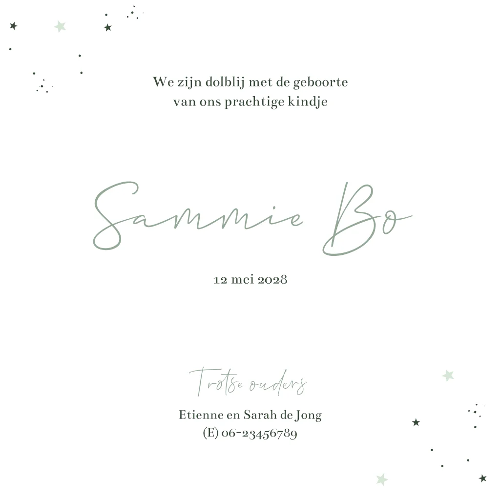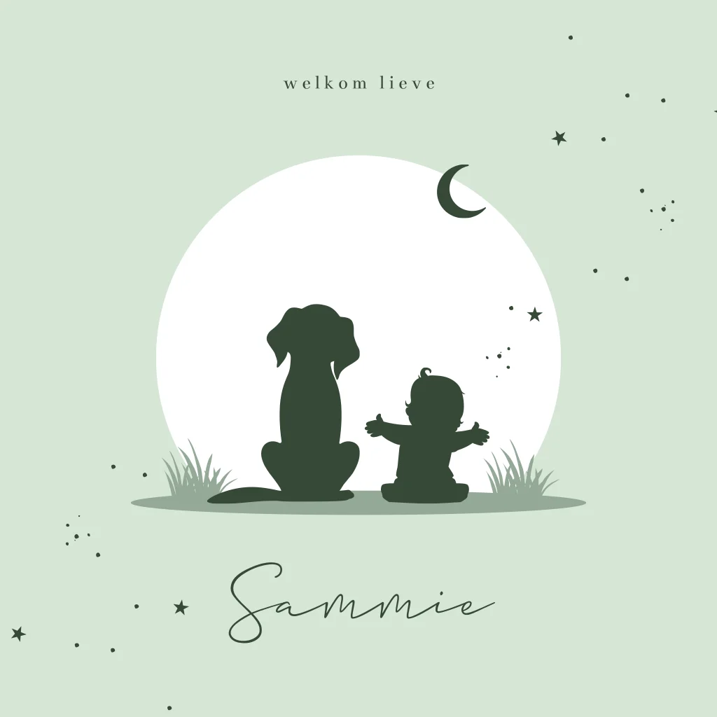 Een prachtig geboortekaartje in groene tinten met een silhouet illustratie van een baby en een lief hondje die samen naar de zonsondergang kijken. De maan en sterren staan al aan de hemel. In sierlijke letters komt de naam van je pasgeboren kindje onderaan. Aan de binnenzijde komt het silhouetje terug en kun je alle geboortegegevens van je kleine plaatsen. Liever andere lettertypes? Pas dit geboortekaartje eenvoudig aan in onze editor.