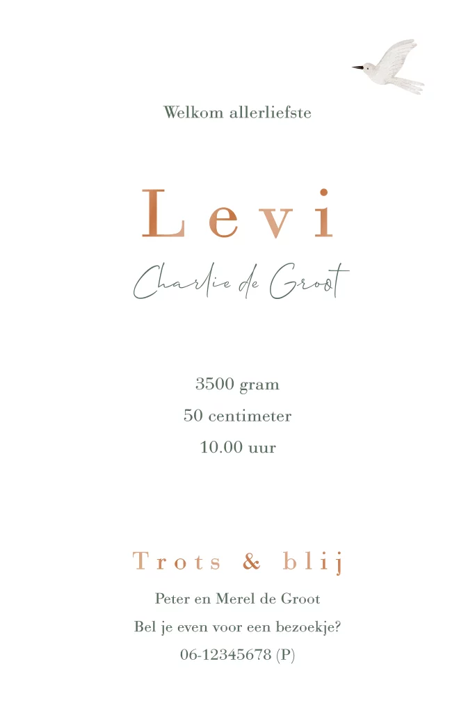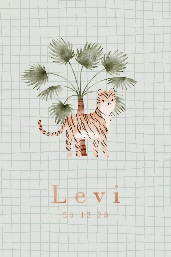 Verwelkom je kleine met dit prachtige groene geboortekaartje. Een getekende tijger en palmboom sieren de voorkant. Op de achtergrond geven subtiele ruitjes een speels tintje. De naam van je kindje schittert in glanzend roestbruin, waardoor dit kaartje een blijvende herinnering wordt aan dit bijzondere moment. Pas de kleuren, lettertypes en foliekleur zelf aan in onze handige editor.