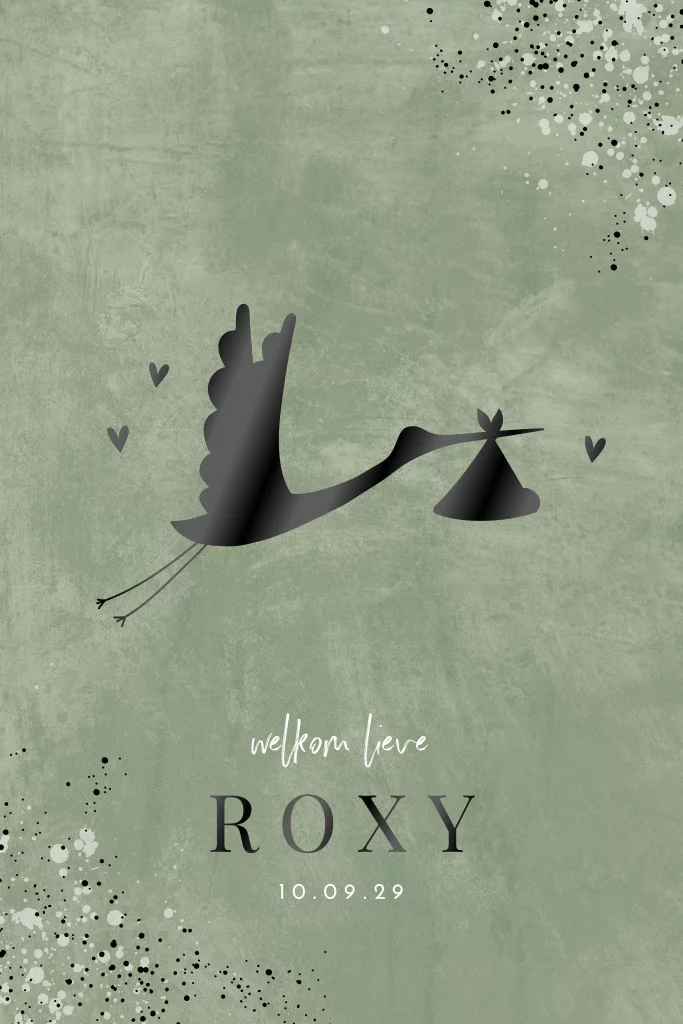 Ben je op zoek naar geboortekaartjes met een ooievaar? Dit prachtige geboortekaartje met een silhouet illustratie van een ooievaar in zwart hoogglans is perfect voor de geboorte van zowel een jongen als een meisje. De stijlvolle groene achtergrond met verfspatten en subtiele hartjes geeft het kaartje een zachte, trendy uitstraling.