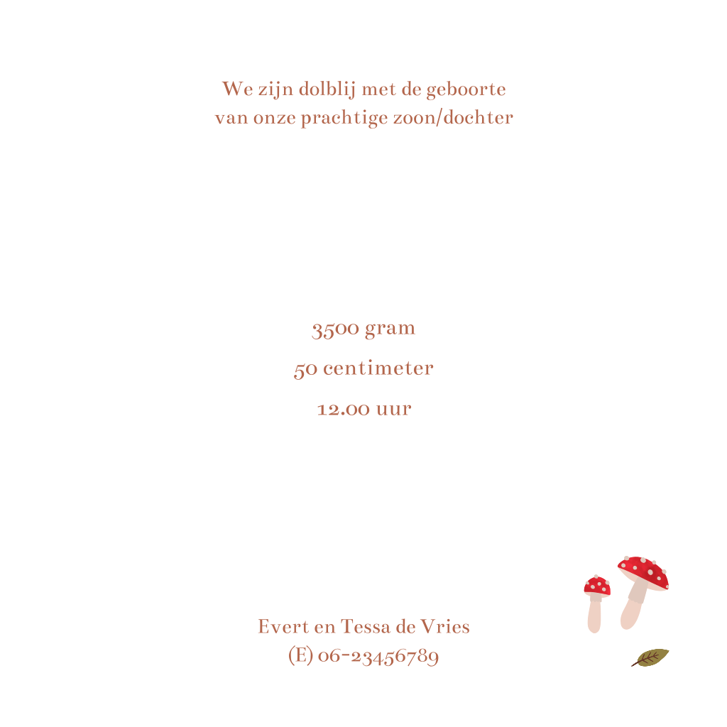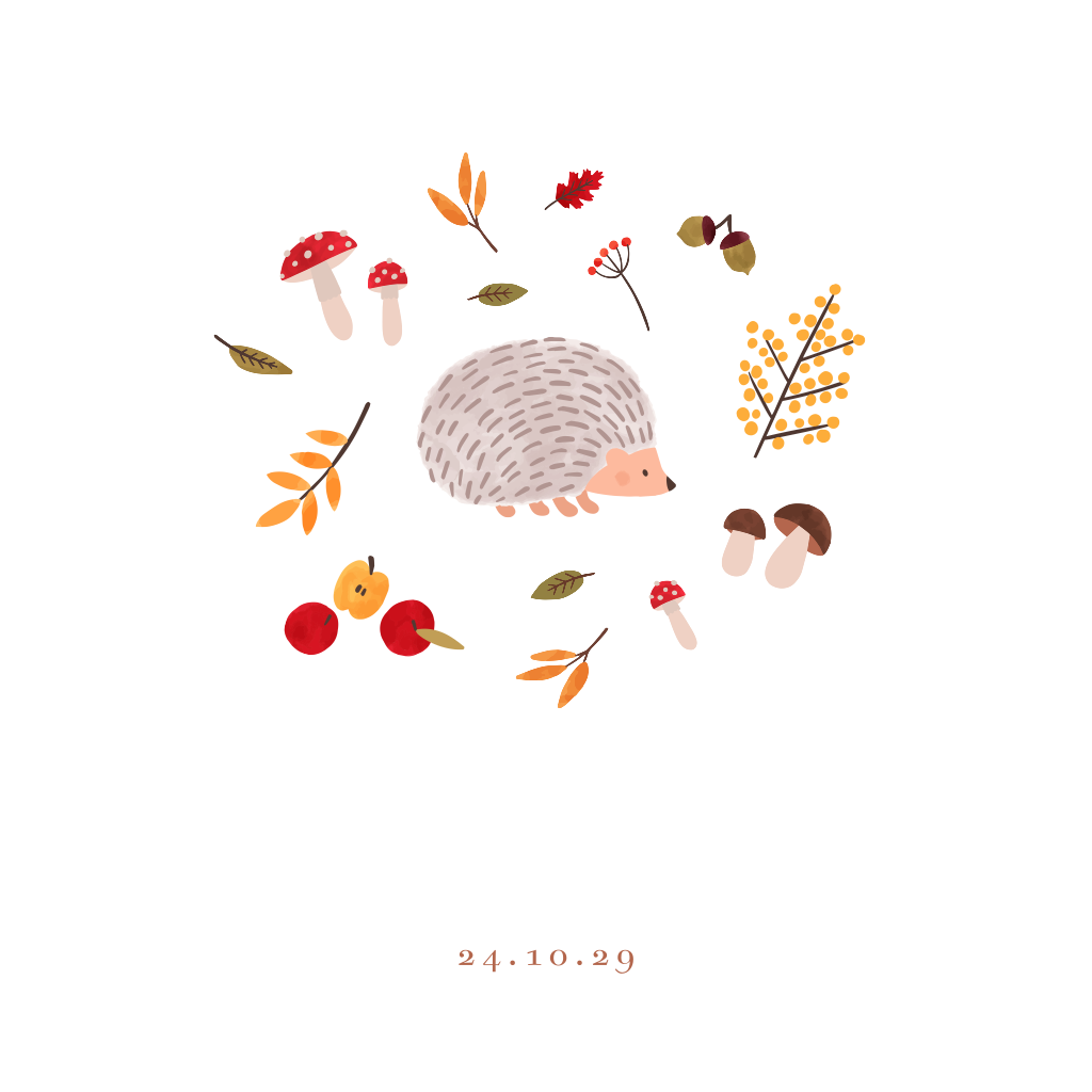 Leuk geboortekaartje voor een herfstkindje! Op dit vierkante kaartje staat een lief egeltje met daaromheen allerlei herfstige elementen: paddenstoeltjes, blaadjes en eikeltjes. De naam van je zoon of dochter komt in klassieke, goudfolie letters onder de lieve tekeningen. Aan de binnenzijde vind je een patroon van meer natuurlijke items, van pompoenen tot appeltjes. Pas dit kaartje zelf aan in onze editor en bestel een proefdruk.