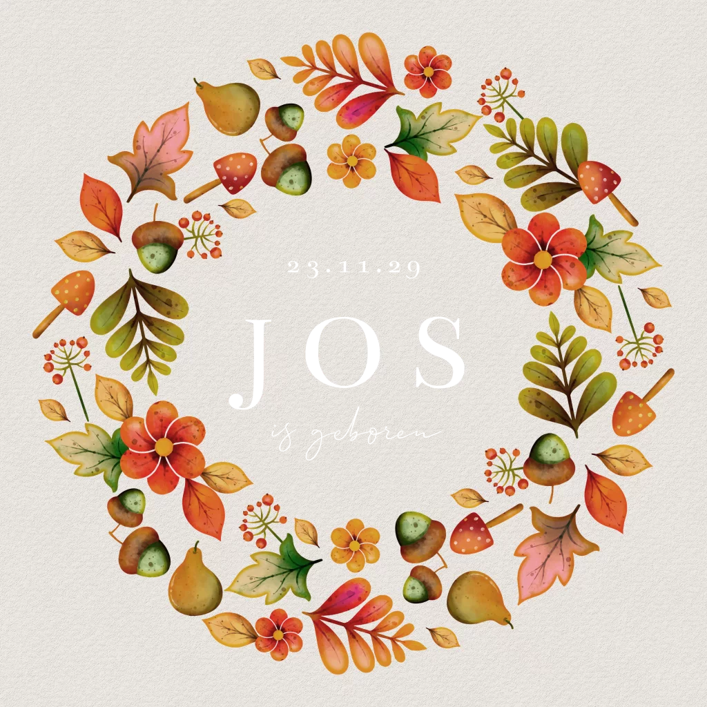 Enkel, vierkant geboortekaartje met goudfolie typografie en herfstkrans in warme tinten. Perfect om de komst van een herfstkindje mee aan te kondigen! Pas dit ontwerp zelf aan in onze ontwerptool.