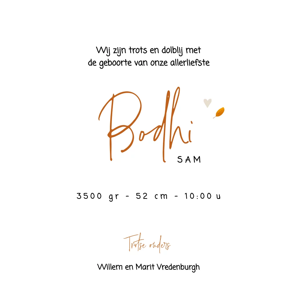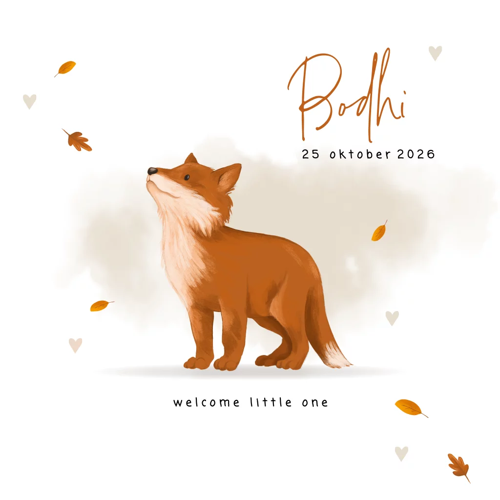 Herfst geboortekaartje met vosje en beige waterverf. Vierkant geboortekaartje met een lieve illustratie op de voorzijde van een vosje. Rondom het vosje dwarrelen blaadjes. De beige waterverf zorgt voor een dromerig effect en maakt het helemaal van nu. Met een sierlijke en moderne letter staat de naam van je pasgeboren kindje groot op de kaart. In de kaart keert het vosje terug, dit keer slapend. Links is ruimte voor een gedichtje en rechts is ruimte voor alle geboortegegevens.