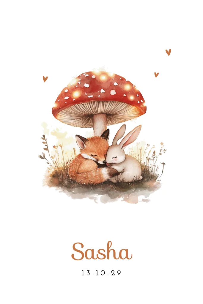 Geboortekaartje met een sfeervolle illustratie in herfststijl. Een vosje en konijntje liggen knus onder een rood-met-witte paddenstoel, omringd door zachte aquareltonen en herfstige details. Het warme kleurgebruik maakt dit ontwerp perfect voor een najaarsbaby. Pas de naam en datum eenvoudig aan in de kaartenmodule.