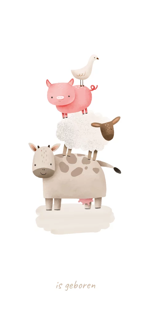 Op dit witte, langwerpige kaartje staan vier gezellige boerderij diertjes opgestapeld. Een koe, schaapje, varkentje en lief eendje. De naam van je kindje staat er in glimmend goudfolie onder en een klein gouden hartje komt bovenaan de kaart. Een vrolijk kaartje dat zowel voor jongens als meisjes geschikt is. Pas dit ontwerp zelf aan in onze editor en bestel een proefdruk.