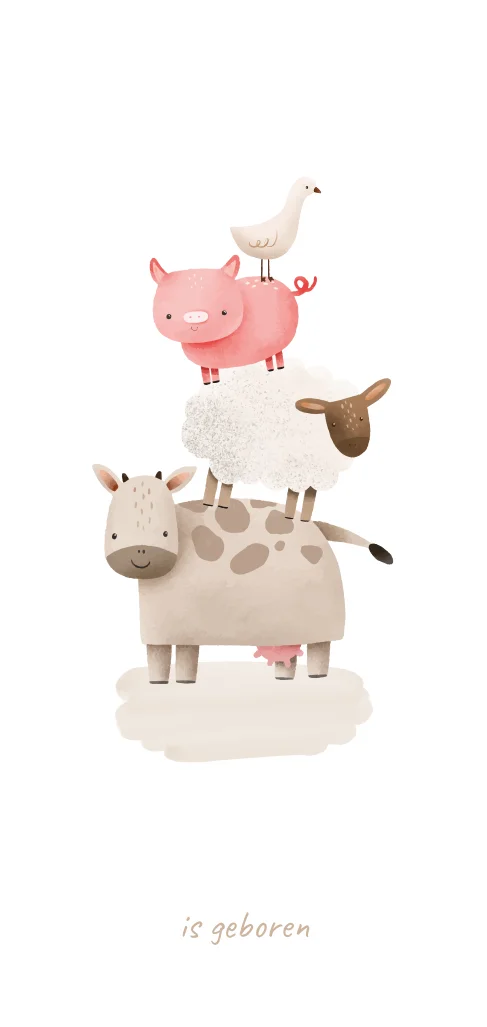 Op dit witte, langwerpige kaartje staan vier gezellige boerderij diertjes opgestapeld. Een koe, schaapje, varkentje en lief eendje. De naam van je kindje staat er in glimmend koperfolie onder en een klein koperen hartje komt bovenaan de kaart. Een vrolijk kaartje dat zowel voor jongens als meisjes geschikt is. Pas dit ontwerp zelf aan in onze editor en bestel een proefdruk.