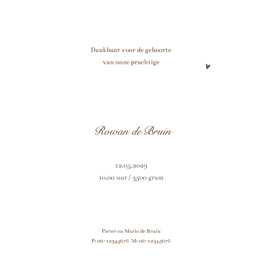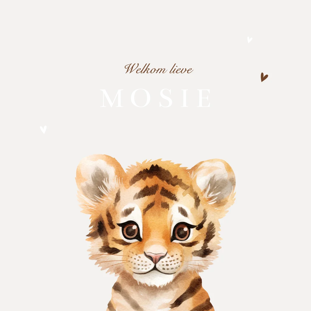 Welkom op de wereld, kleine welp! Verwelkom je kleintje met een bijzonder geboortekaartje, versierd met prachtig koperfolie en een schattig tijgertje en hartjes. Dit vierkante kaartje straalt warmte en liefde uit, perfect om de komst van jullie nieuwste familielid te vieren. Aan de binnenzijde komt het tijgertje terug, nieuwsgierig in de hoek van de kaart. Plaats een lief gedichtje en de geboortegegevens van je kindje in de kaart om het geheel af te maken. Bestel een proefdrukje om dit geboortekaartje in het echt te kunnen bewonderen.