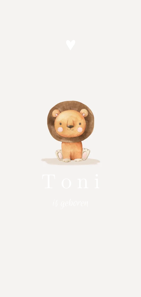 Eenvoudig, maar lief geboortekaartje met schattig waterverf leeuwtje op een beige achtergrond. De naam van je kindje komt in prachtig koperfolie onder het leeuwtje te staan. Maak gebruik van onze ontwerptool om het kaartje aan te passen naar jouw wensen, zoals het kiezen van een ander lettertype of achtergrondkleur.
