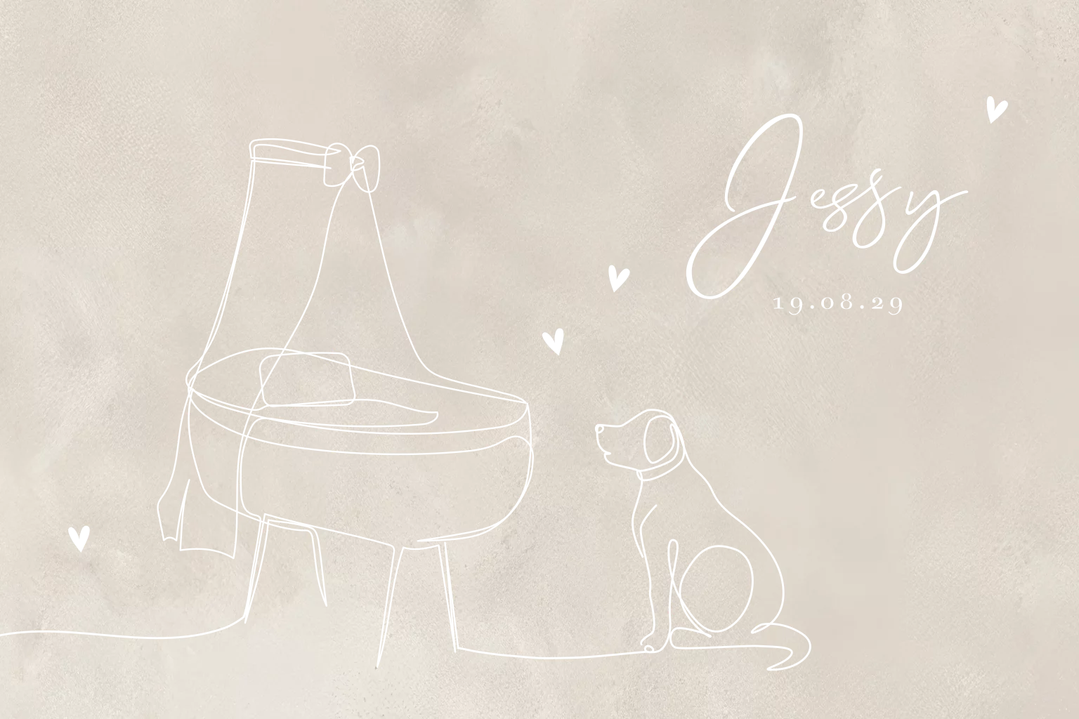 Heb je een hond en wil je die een bijzonder plekje op het geboortekaartje van je aanstaande kindje geven? Ga voor dit lieve geboortekaartje in beige kleur met goudfolie lijntekening van een hond en een wiegje. De naam van je kleine komt in een bijpassend lettertype bovenaan. Aan de binnenzijde is ruimte voor alle geboortegegevens. Pas dit kaartje zelf aan in onze ontwerptool en bestel een proefdruk.