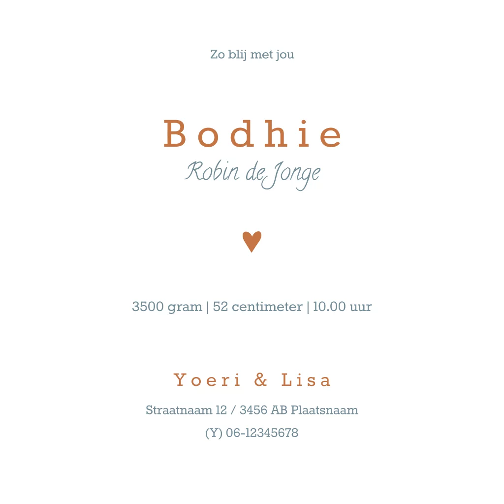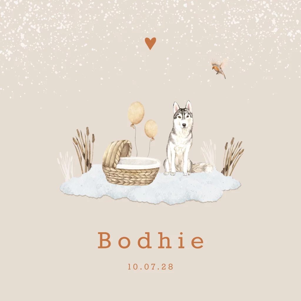 Is er een winterkindje op komst? Kondig zijn of haar geboorte aan met dit mooie geboortekaartje met waterverf illustraties van een wiegje in de sneeuw, samen met je trouwe viervoeter. Kies zelf een andere hond (of kat!) in onze editor om deze kaart te personaliseren. De naam van je kindje komt in roestbruine letters voorop. Pas dit winterse ontwerp zelf aan in onze handige editor.
