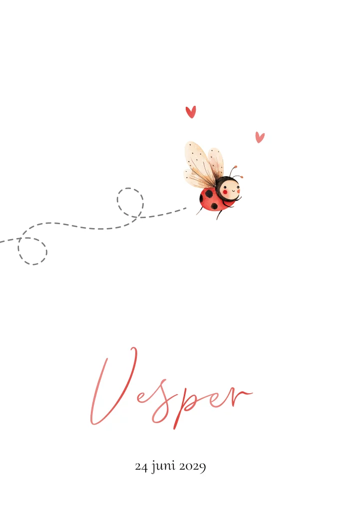 Op zoek naar geboortekaartjes met een lieveheersbeestje? Dit vrolijke geboortekaartje is perfect voor een lentebaby! Het schattige lieveheersbeestje met rode hartjes en speels vliegspoor brengt direct een glimlach op je gezicht. De minimalistische stijl met neutrale kleuren maken dit kaartje geschikt voor zowel een jongen als een meisje.