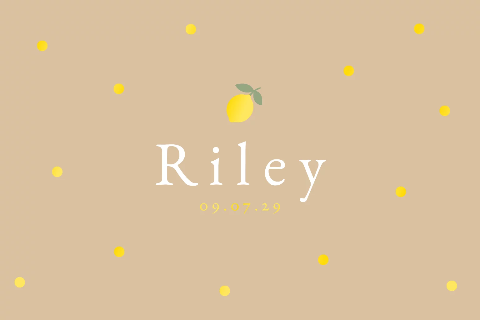 Vrolijk geboortekaartje in lichtbruine kleur met hoogglans citroentje en polkadots. Een lief kaartje om de komst van je pasgeboren kindje mee aan te kondigen. De gele stipjes en citroen op de voorzijde krijgen een glimmend hoogglans laagje en springen dus van het papier af. Pas de kleuren en lettertypes eventueel aan in onze handige editor en bestel een proefdruk.