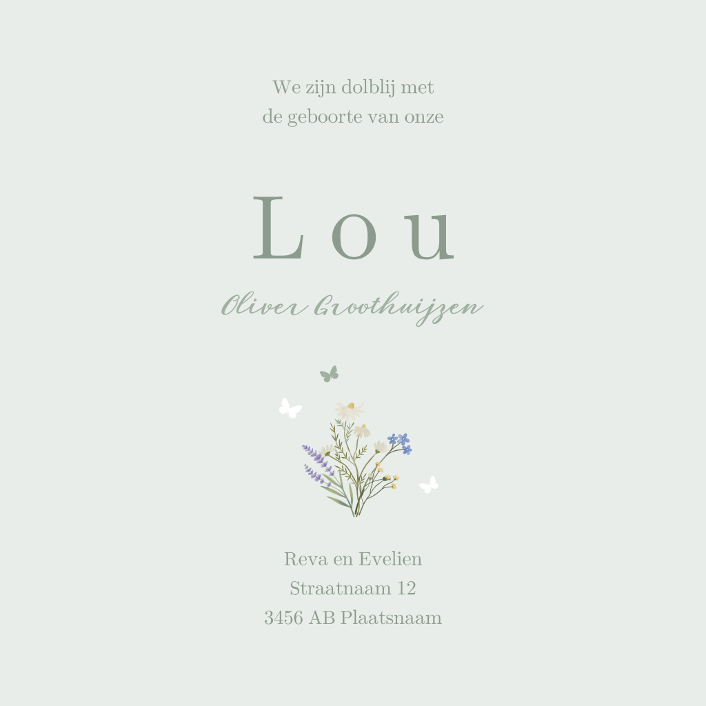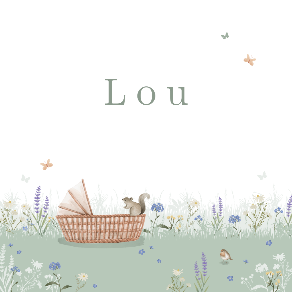 Een nieuwsgierig eekhoorntje spiekt in een wiegje dat in een veld vol prachtige bloemen staat. Een klein roodborstje kijkt toe en talloze vlindertjes fladderen rond. Een schattig geboortekaartje om de komst van je pasgeboren kindje aan te kondigen aan alle vrienden en familie. Aan de binnenzijde komt het wiegje terug en kun je alle gegevens van je kleintje plaatsen. Gebruik onze handige editor om je eigen draai te geven aan dit dromerige geboortekaartje.