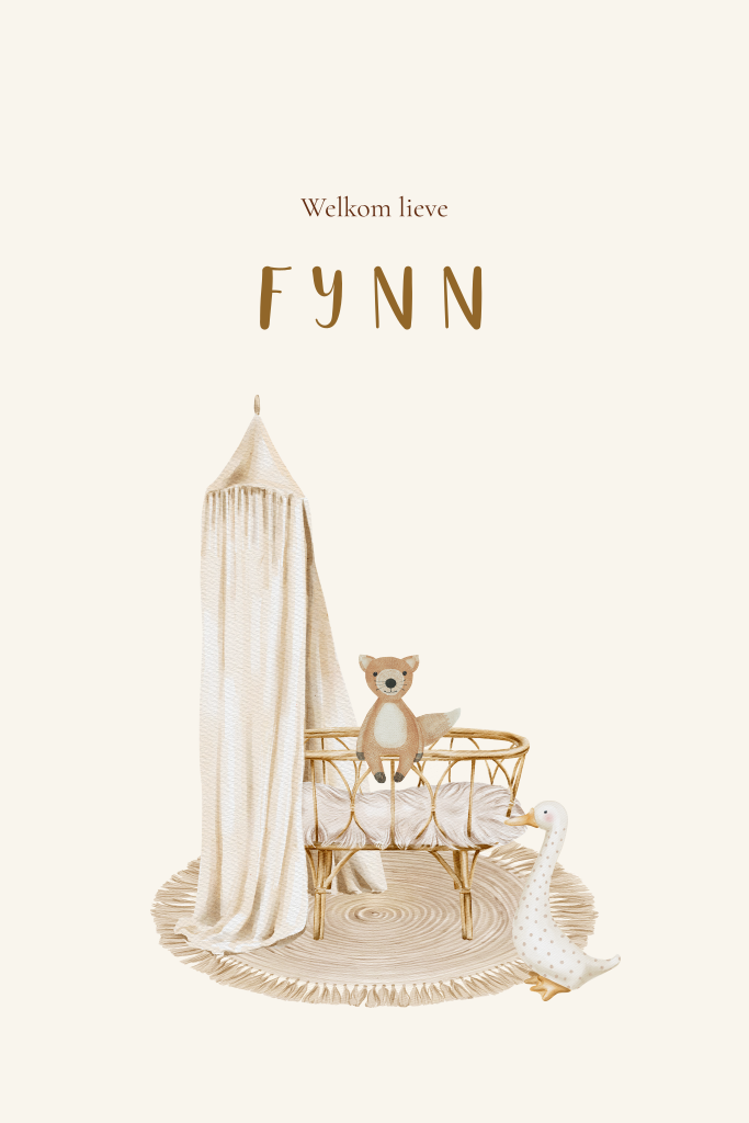 Neutrale geboortekaartje zijn helemaal hip! Wordt er binnenkort bij jullie een kindje geboren? Dit beige geboortekaartje met rotan wiegje met hemel en klein vosje op de rand is helemaal volgens de laatste trends en kan zowel voor een jongen als meisje.