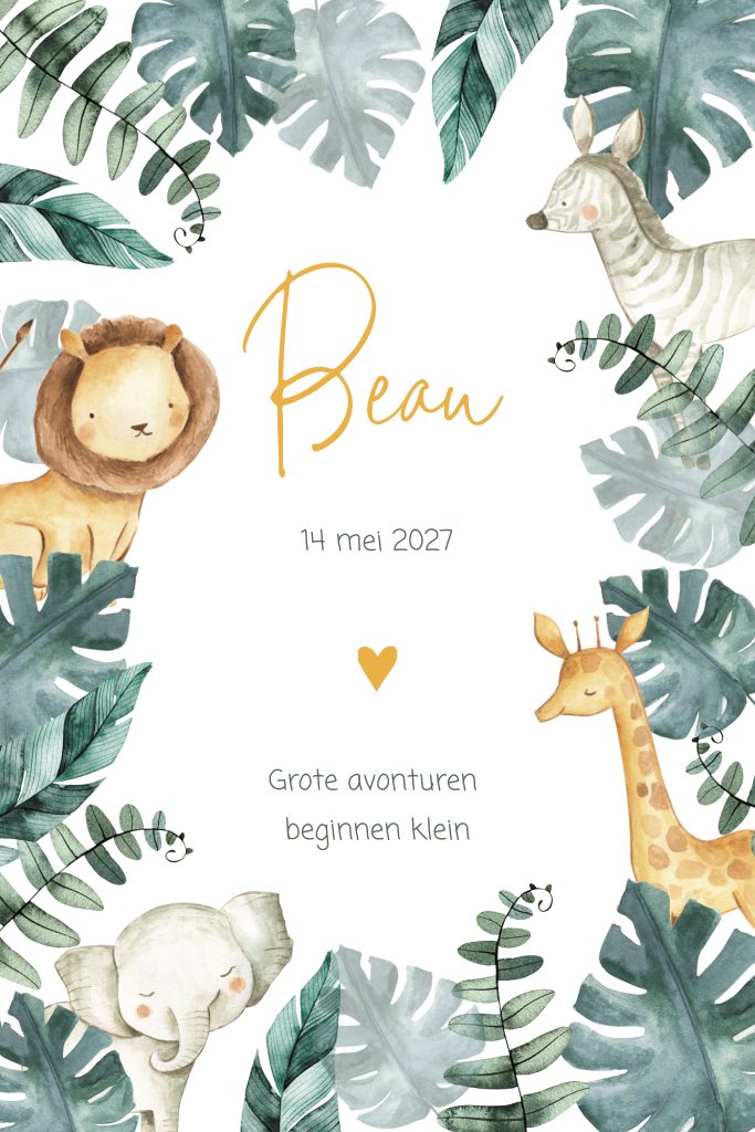 Neutraal safari geboortekaartje met diertjes en bladeren