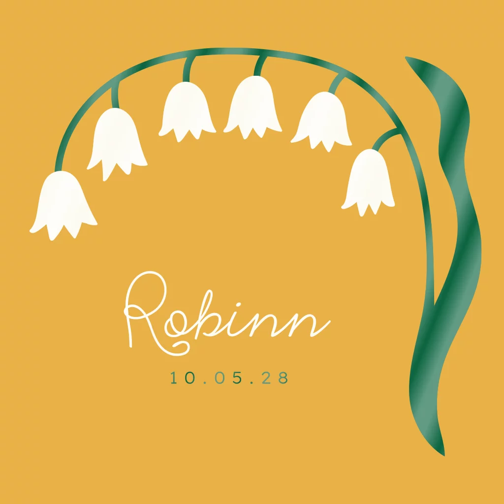 Origineel geboortekaartje in vrolijke, okergele kleur met hoogglans illustratie van een meiklokje - oftewel een lelietje-van-dalen. Deze bloem is de geboortebloem van mei, dus extra leuk voor een meikindje! De naam van je kindje komt in off white hoogglans onder de klokjes. Een trendy ontwerp voor jouw pasgeboren kindje! Pas de kleuren gemakkelijk zelf aan in onze ontwerptool.