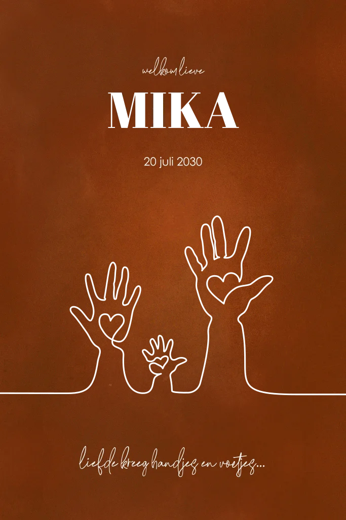 Goudfolie geboortekaartje met oneline lijntekening met drie handen roestrood. Monolines zijn helemaal van nu! Dit hippe geboortekaartje met roestrode achtergrond heeft een lijntekening van drie handjes op de voorkant. Deze tekening kan in verschillende kleuren folie worden gedrukt voor een extra stijlvolle uitstraling. Met stoere typografie staat de naam van je kindje bovenaan de kaart. Op de achterzijde zie je een mooie lijntekening van de geboorte iconen. Hier kun je de geboortegegevens kwijt. Pas de kleuren en lettertypes aan om je kaartje te personaliseren en bestel een drukproef.