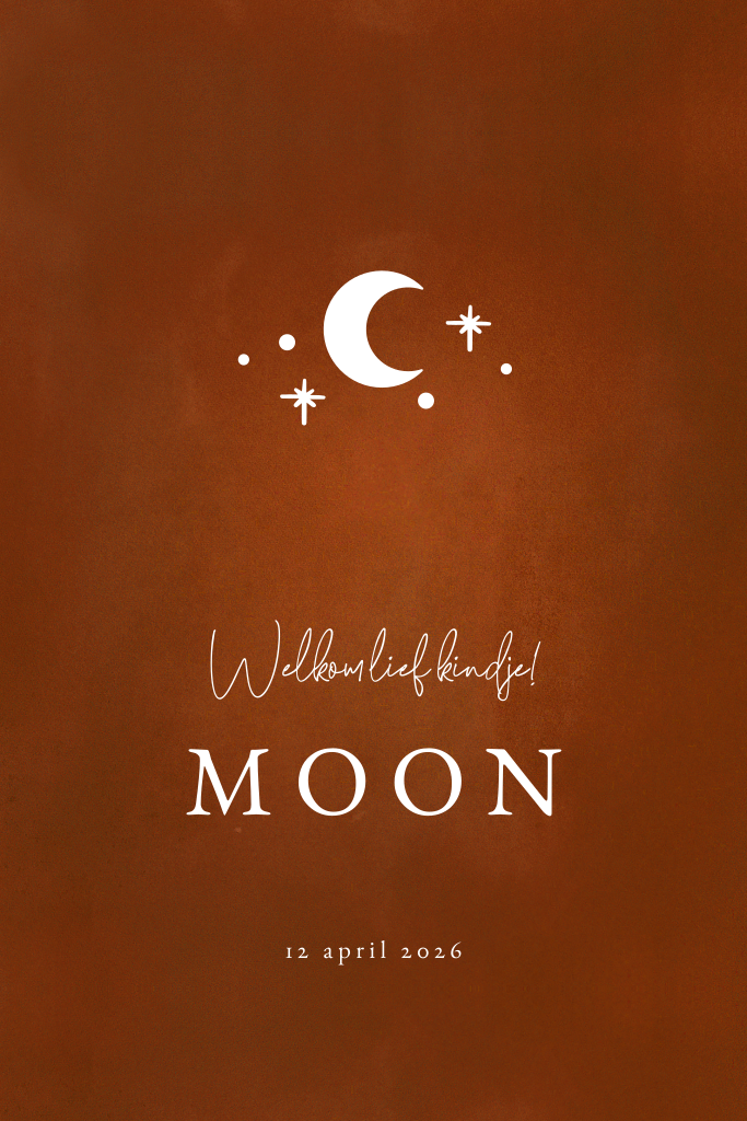 Roestrood geboortekaartje maantje en sterretjes met goudfolie. Enkel geboortekaartje met de populaire kleur roestrood. In combinatie met de goudfolie naam en het maantje krijgt het kaartje een extra stijlvolle uitstraling. Op de achterzijde keert het maantje in goudfolie terug en kun je alle geboortegegevens plaatsen. Pas de kleuren en lettertypes naar wens aan en bestel een drukproef om de glans op het kaartje in het echt te bekijken.