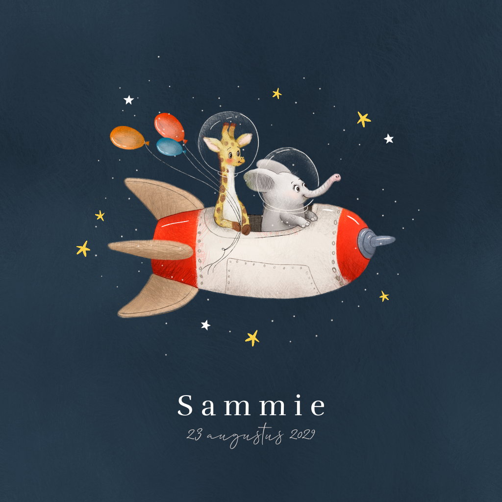 Vrolijk geboortekaartje met ruimte thema voor je aanstaande kindje. Een giraf en olifant zitten in een raket en vliegen over de blauwe achtergrond vol sterretjes. Een aantal van deze sterren plus de naam van je kleine worden gedrukt in goudfolie. Pas dit kaartje zelf aan in onze editor en bestel een proefdruk.