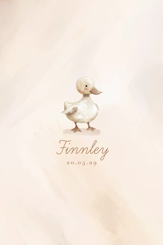 Beige geboortekaartje met waterverf tekening van een lief eendje en de naam in sierlijke letters. Dit beige geboortekaartje voor zowel een jongen als meisje een lieve geboorte aankondiging. Het eendje komt terug op de achterkant. Dit kaartje is volledig te personaliseren in onze gebruiksvriendelijke editor.