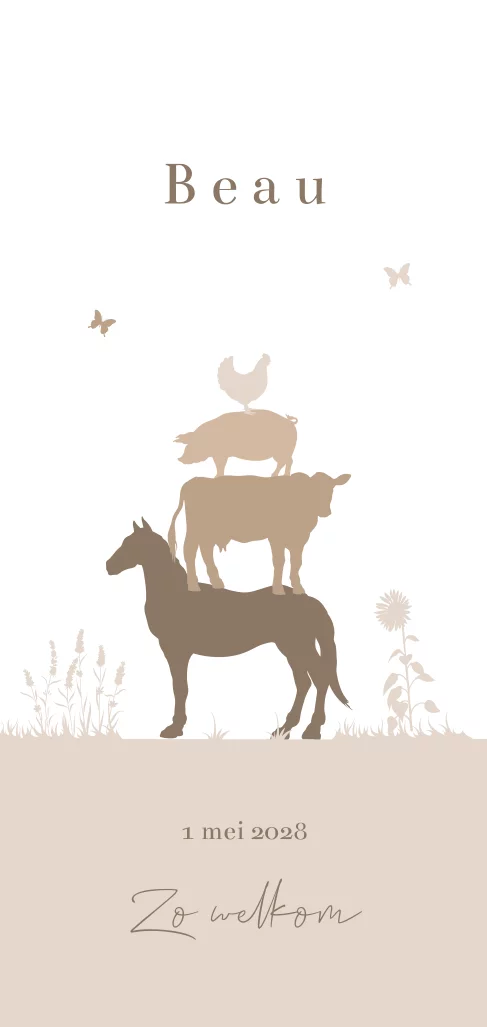 Neutraal silhouet geboortekaartje om de geboorte van een jongen of meisje aan te kondigen. Ontwerp in beige tinten met gestapelde boerderijdieren nl: een paard, daarop een koe, varken en bovenop een haan. Je kunt de kaart zelf aanpassen met de editor. Bestel een proefdruk om het kaartje in het echt te zien.