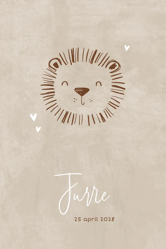 Beige geboortekaartje met bruine tekening van een leeuw en de naam in mooi koperfolie. Hou jij van een minimalistisch geboortekaartje maar wil je toch een stoer uiterlijk? Dit beige geboortekaartje voor zowel een jongen als meisje heeft een subtiele illustratie van een leeuw in het midden. Met speelse lettertypes staan de naam en datum in blinkende koperfolie.