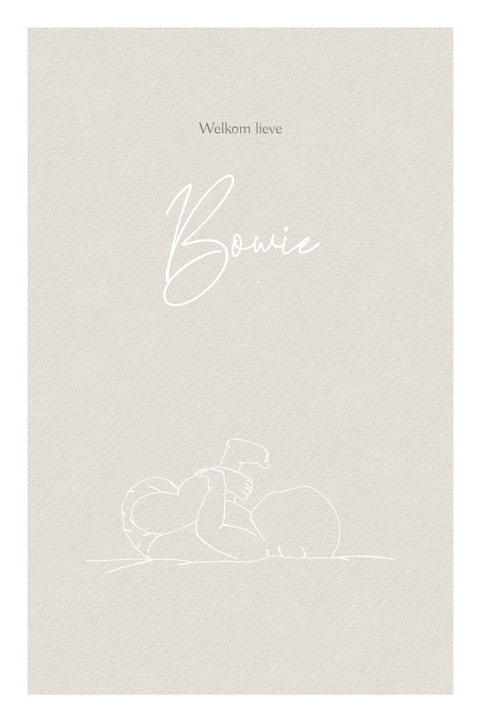 Stijlvol geboortekaartje met lijntekening van een liggend baby gedrukt in koperfolie. De kaart heeft een witte rand. Dit neutrale geboortekaartje kan zowel voor een jongen als meisje, pas naar wens aan en bestel een drukproef.