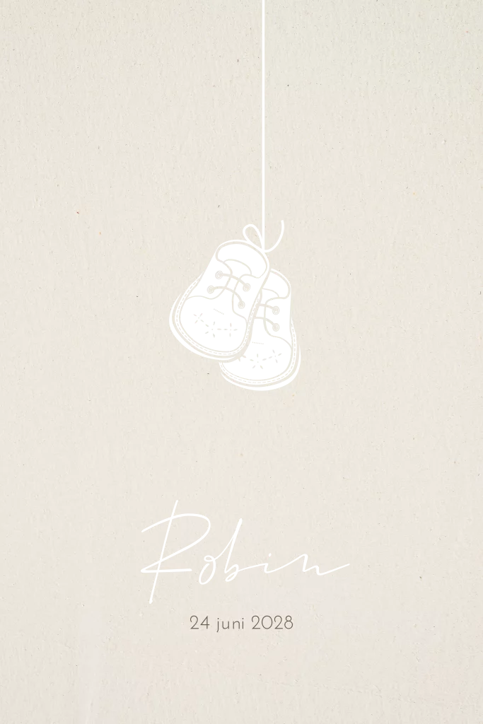Klassiek geboortekaartje in beige voor de geboorte van een zoon of dochter met babyschoentjes gedrukt in goudfolie. Pas dit unisex geboortekaartje naar wens aan en bestel een drukproef.
