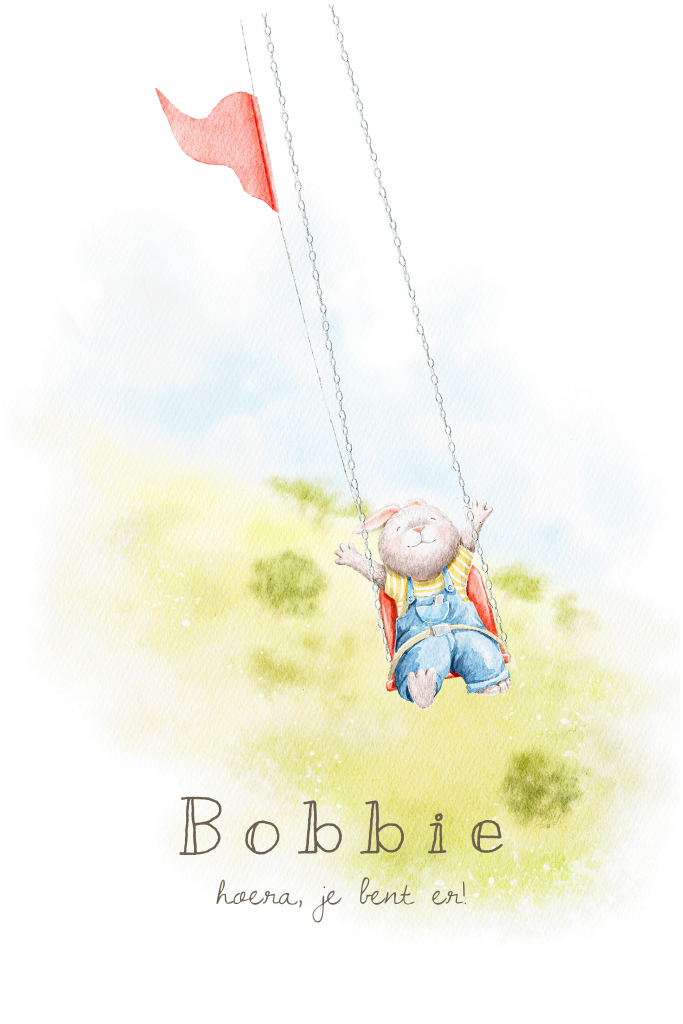 Een vrolijk geboortekaartje met lieve waterverf illustratie van een konijntje dat zorgeloos geniet in een zweefmolen. Een aandoenlijke tekening! De naam van je kindje komt in speelse letters onderaan dit kaartje in unieke vorm. Liever een ander lettertype? Dat kan! Pas dit geboortekaartje naar eigen wens aan in onze handige editor. Op de achterzijde komt het konijntje fietsend voorbij en kun je alle info over je kindje kwijt.
