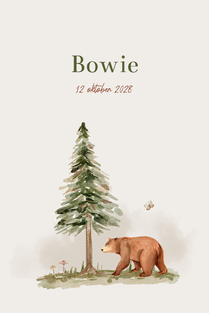 Mooi met waterverf geschilderd geboortekaartje met beer bij dennenboom. Er staat kleine paddestoelen in het gras en een lief vlindertje vliegt rond. De kaart heeft afgeronde hoeken, dat maakt het geheel wat zachter. Dit kun je zelf aan of uitzetten bij 'Achtergrond' en dan 'kaartrand' in de ontwerptool. Pas de kaart naar wens aan.