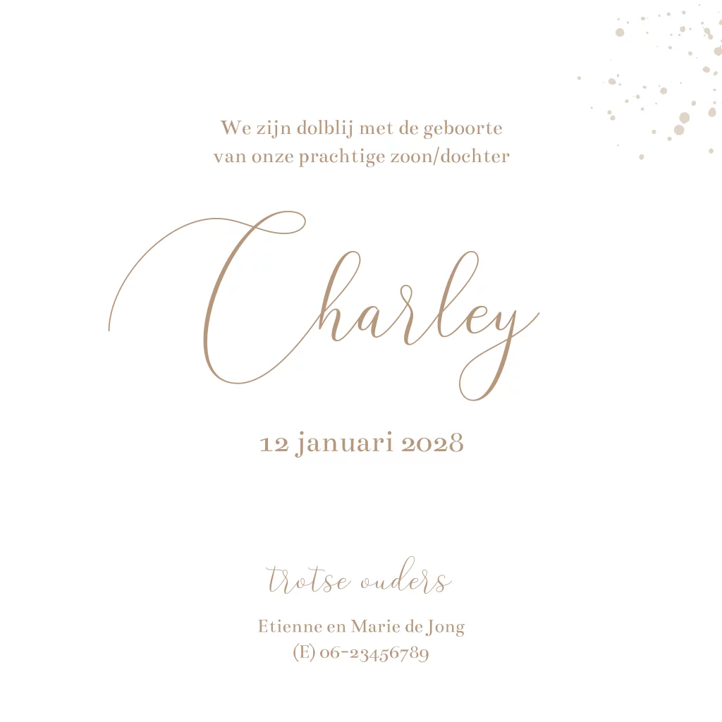 Geboortekaartje in een winters jasje met een silhouet van een kindje op een slee. De achtergrond bestaat uit besneeuwde bomen en sneeuwvlokken in zachte beige tinten. Een strak en neutraal ontwerp, perfect voor zowel de geboorte van een jongen als een meisje. Personaliseer en bestel eenvoudig een proefdruk.