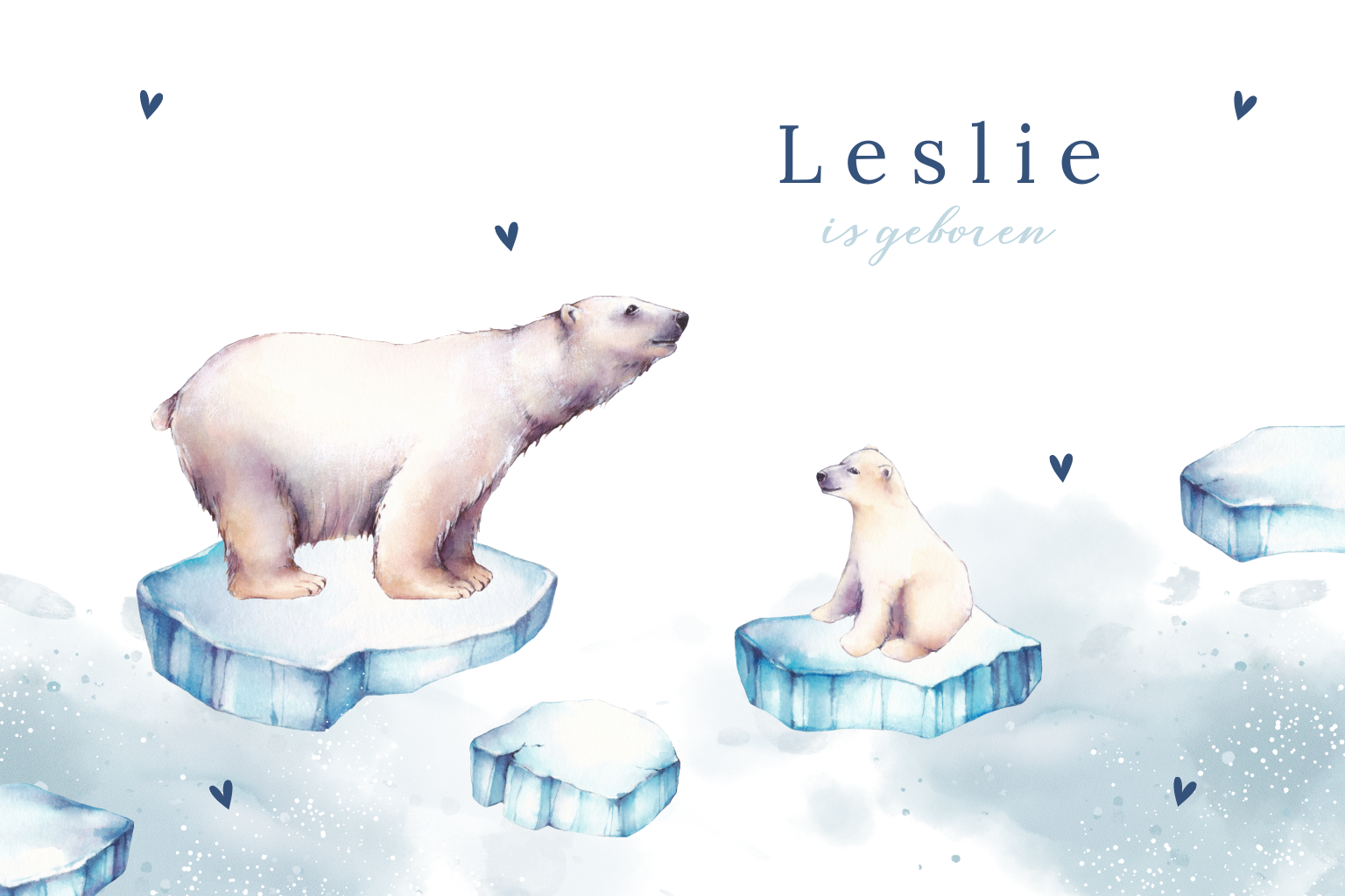 Lief geboortekaartje met ijsberen, blauwe waterverf en kleine hartjes. Dit enkele kaartje met afgeronde hoeken en waterverf illustraties is perfect voor een kindje dat geboren wordt in de winter! Pas dit ontwerp zelf naar eigen wens aan in onze editor.