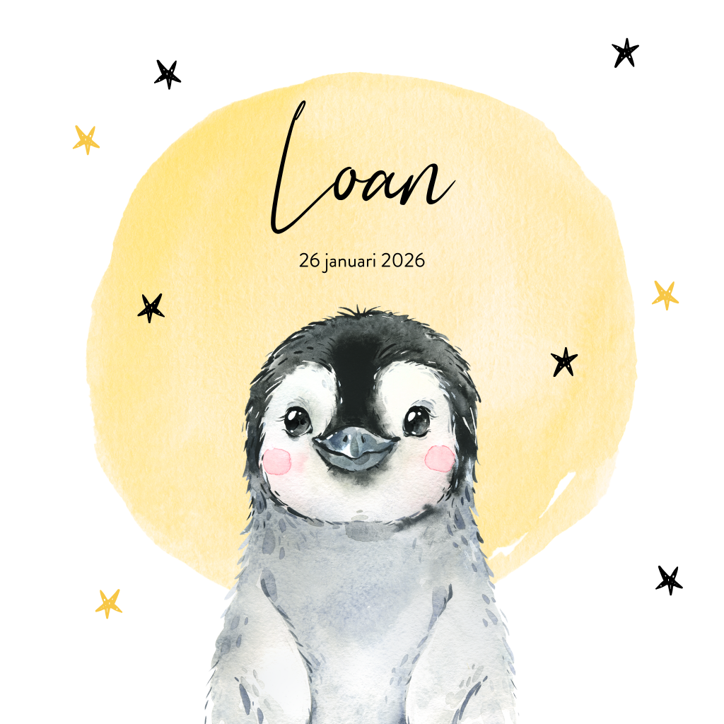 Winter geboortekaartje unisex met pinguin, sterren en gele waterverf