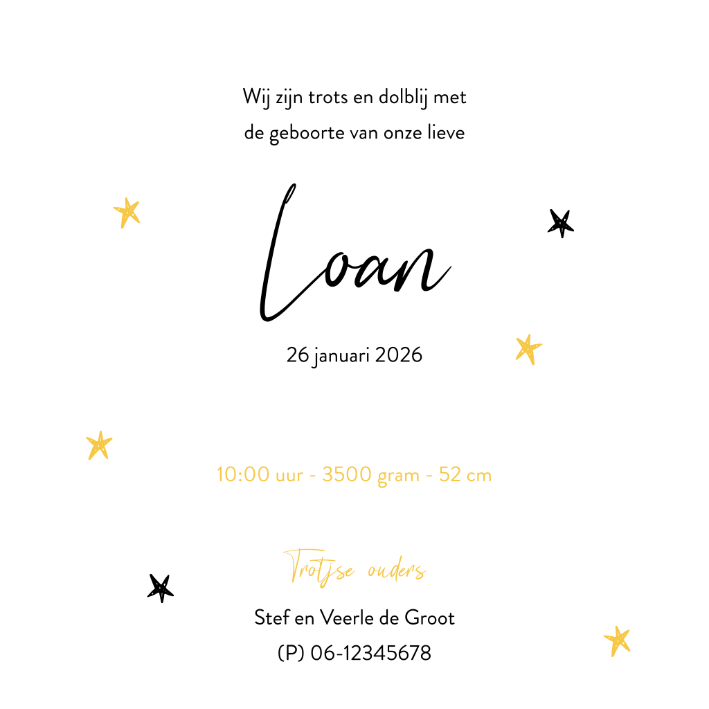 Is er een kindje op komst? Dit leuke geboortekaartje met pinguïn en sterren is perfect. Dit schattige geboortekaartje met illustratie van een pinguïn is geschilderd met waterverf. Ook dwarrelen er allerlei sterretjes om deze pinguïn heen. Deze sterretjes zijn ook op de rest van de kaart terug te vinden. In de kaart is ruimte voor de geboortegegevens en een mooie oneliner. Ook kun je eventueel een gedichtje toevoegen.