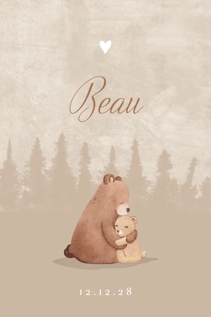Dit lieve geboortekaartje, met schattige knuffelende beertjes, is een viering van de komst van je zoon of dochter. De beertjes omhelzen elkaar liefdevol te midden van een sprookjesachtig boslandschap in beige en zandkleurige tinten. Daarboven komt de naam van je kindje in prachtig sierlijke letters. Pas dit kaartje naar eigen wens aan in onze handige editor.
