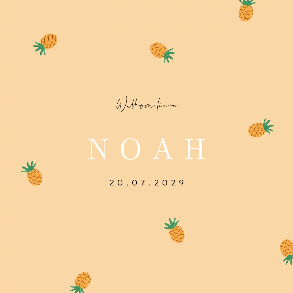 Een geboortekaartje met Mediterrane invloeden, gekenmerkt door een achtergrond vol schattige ananasjes. Fruit wordt dit jaar helemaal in. Verwacht je de komst van je kleintje deze lente of zomer? Dan is dit ontwerp absoluut perfect voor de aankondiging van de geboorte van jouw kindje.