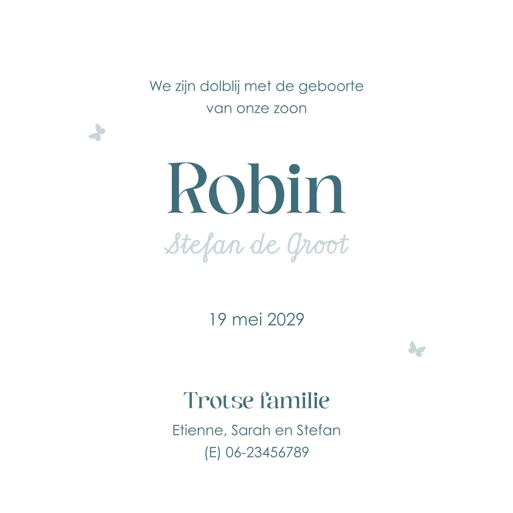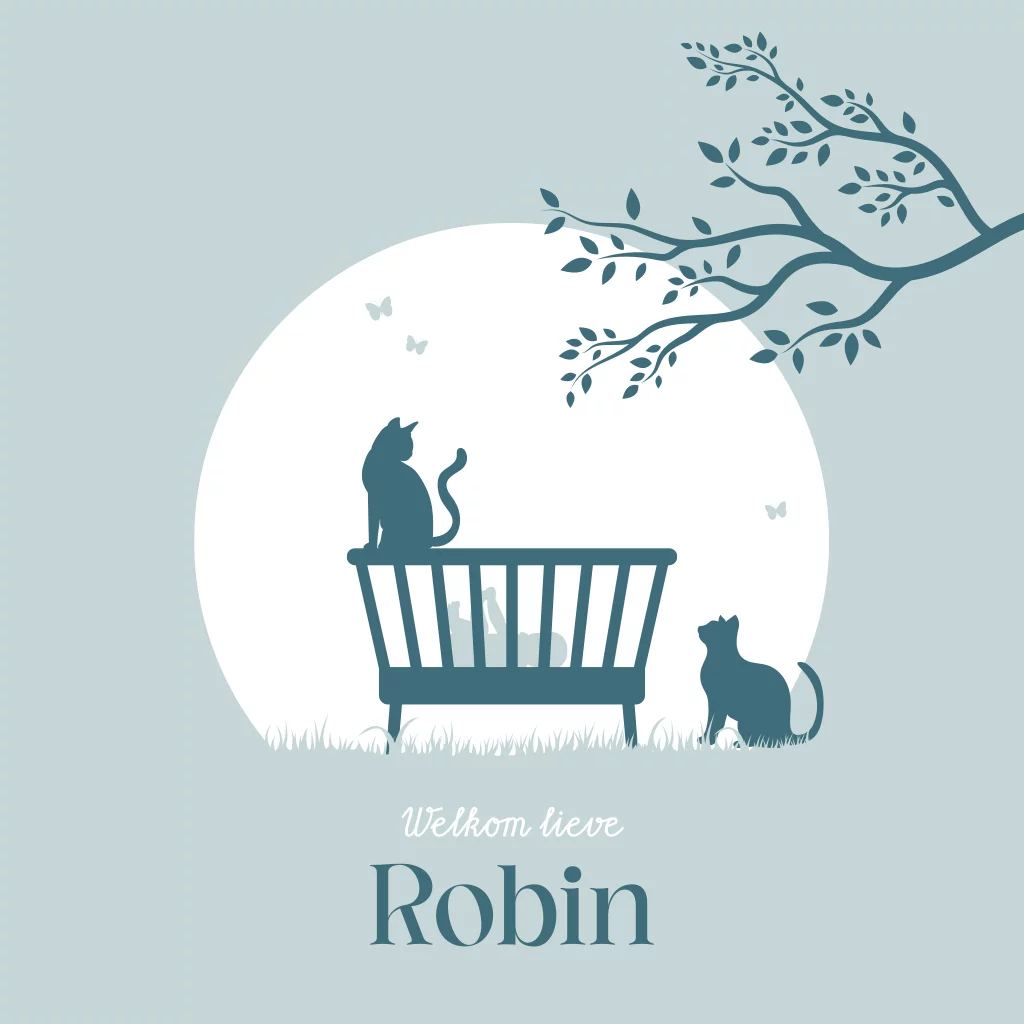 Geboortekaart met een wiegje in het gras en twee nieuwsgierige poesjes, alles in silhouet. Pas het kaartje voor je zoontje aan in de editor en bestel een proefdruk.