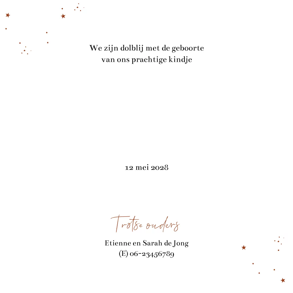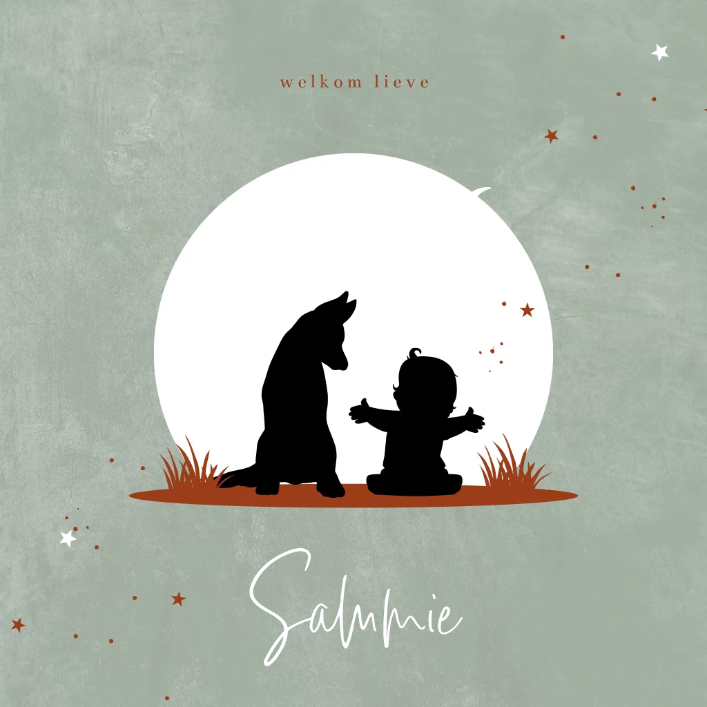 Grijsgroen geboortekaartje met silhouet van een baby en een leuke herdershond die samen naar de zonsondergang kijken. De maan en sterren staan al hoog aan de hemel. In sierlijke letters komt de naam van je pasgeboren kindje onderaan gedrukt in goudfolie. Aan de binnenzijde komt het silhouetje terug en kun je alle geboortegegevens van je kleine plaatsen. Liever andere lettertypes? Pas dit geboortekaartje eenvoudig aan in onze editor.