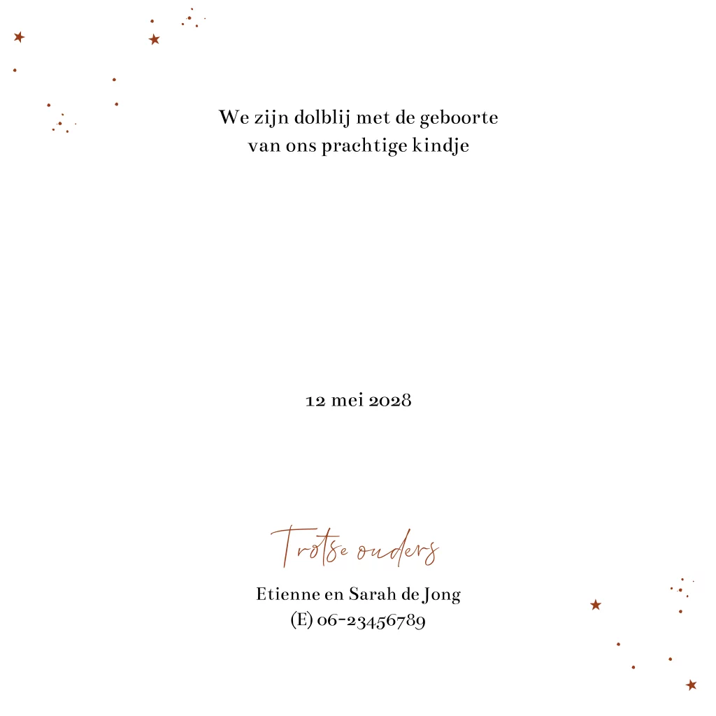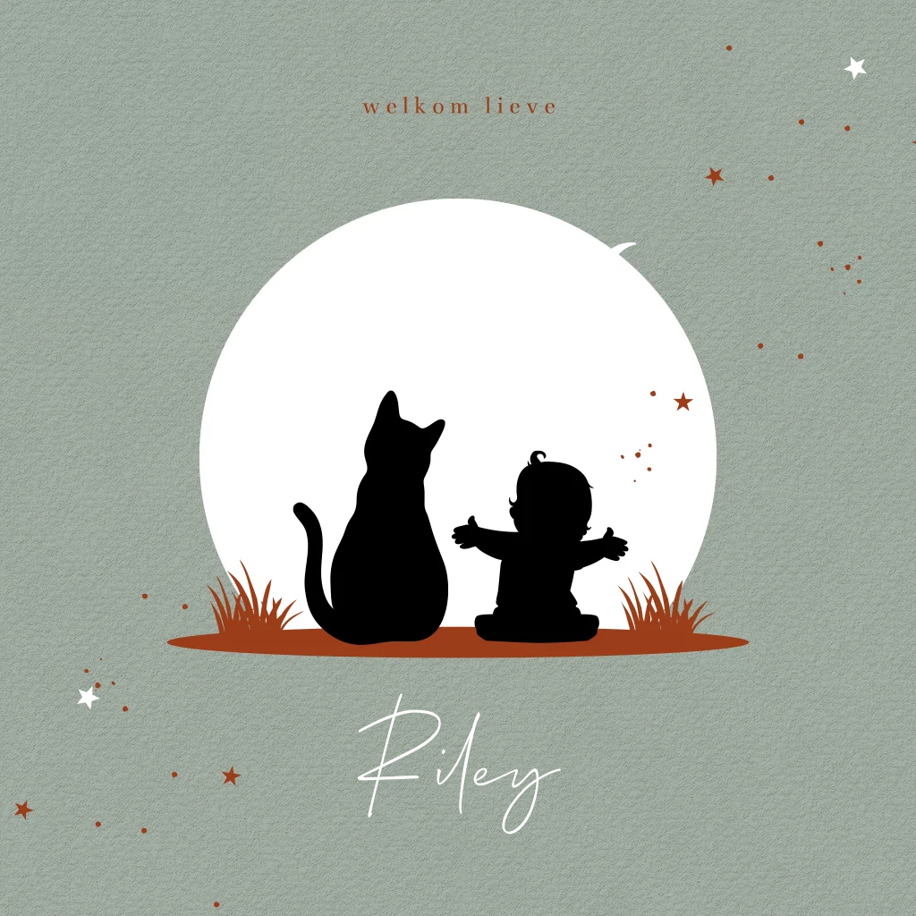 Grijsgroen geboortekaartje met silhouet van een baby en een leuke kat die samen naar de zonsondergang kijken. De maan en sterren staan al hoog aan de hemel. In sierlijke letters komt de naam van je pasgeboren kindje onderaan. Aan de binnenzijde komt het silhouetje terug en kun je alle geboortegegevens van je kleine plaatsen. Liever andere lettertypes? Pas dit geboortekaartje eenvoudig aan in onze editor.